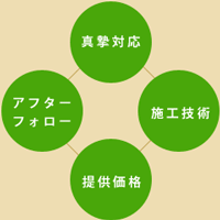 当社はお客様のご要望に真摯に対応する姿勢、施工技術の高さ、サービスを提供する価格、施工後も安心してお任せいただけるアフターフォロー。 四位一体を柱にするリフォーム会社です。